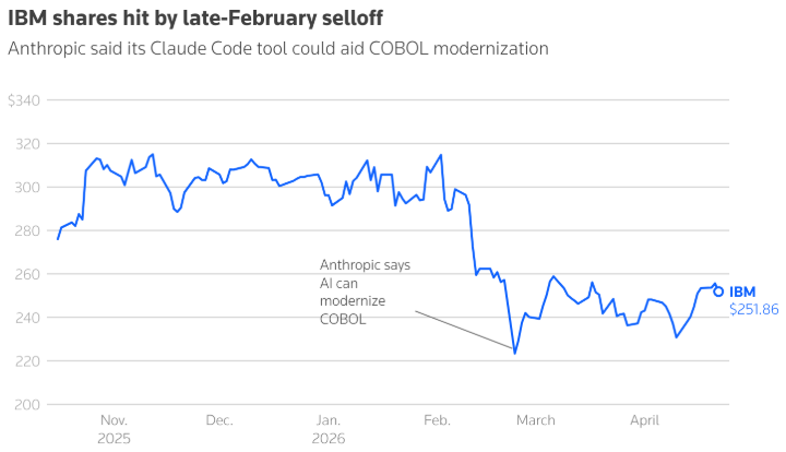 该公司的新战略使其成为投资者的关注焦点,这些投资者担心人工智能工具将取代许多现有的软件产品。今年2月,AI初创公司Anthropic发布了一款名为Claude Code的工具,声称能帮助实现COBOL(一种在IBM大型机上运行数十年的过时编程语言)代码的现代化迁移。消息一出,IBM股价遭遇数十年来最大幅度的抛售。