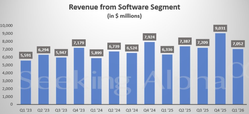 该公司周三在一份声明中表示,截至3月31日的季度,软件收入增长11%至70.5亿美元,略高于预期的70.2亿美元。总收入增长9%至159亿美元,高于分析师平均预期的157亿美元。调整后每股收益为1.91美元,同样高于预期。
