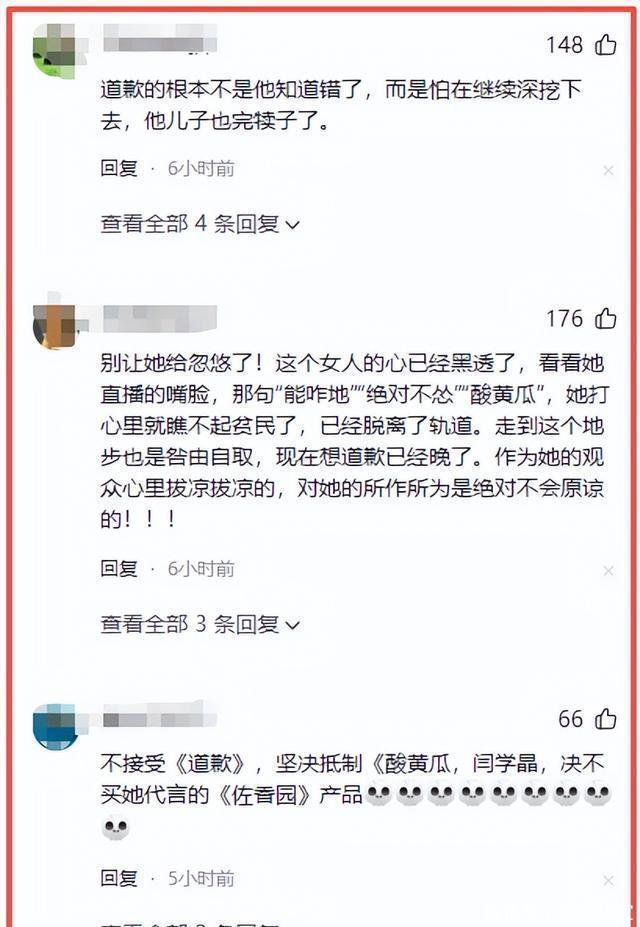 舆论发酵初期,闫学晶团队的应对堪称“灾难级”。 面对网友的批评,他们没有及时回应澄清,反而关闭评论区、删除争议内容。 甚至有旧料被恶意嫁接成“闫学晶怒怼网友酸黄瓜”的视频,进一步激化矛盾。