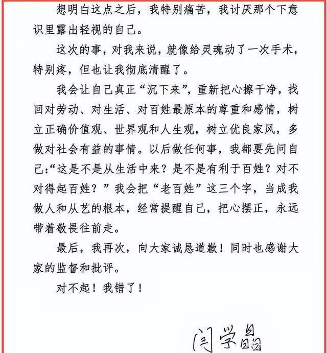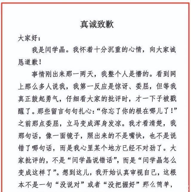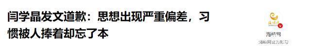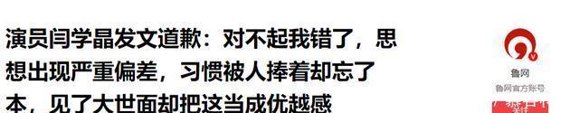 参考信源: 鲁网|演员闫学晶发文道歉:对不起我错了,思想出现严重偏差,习惯被人捧着却忘了本,见了大世面却把这当成优越感 海峡网|闫学晶发文道歉:思想出现严重偏差,习惯被人捧着却忘了本